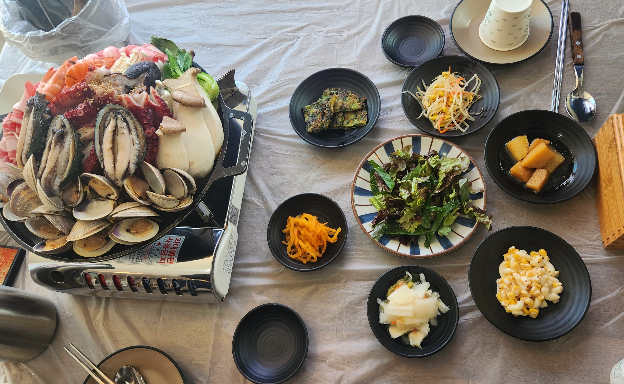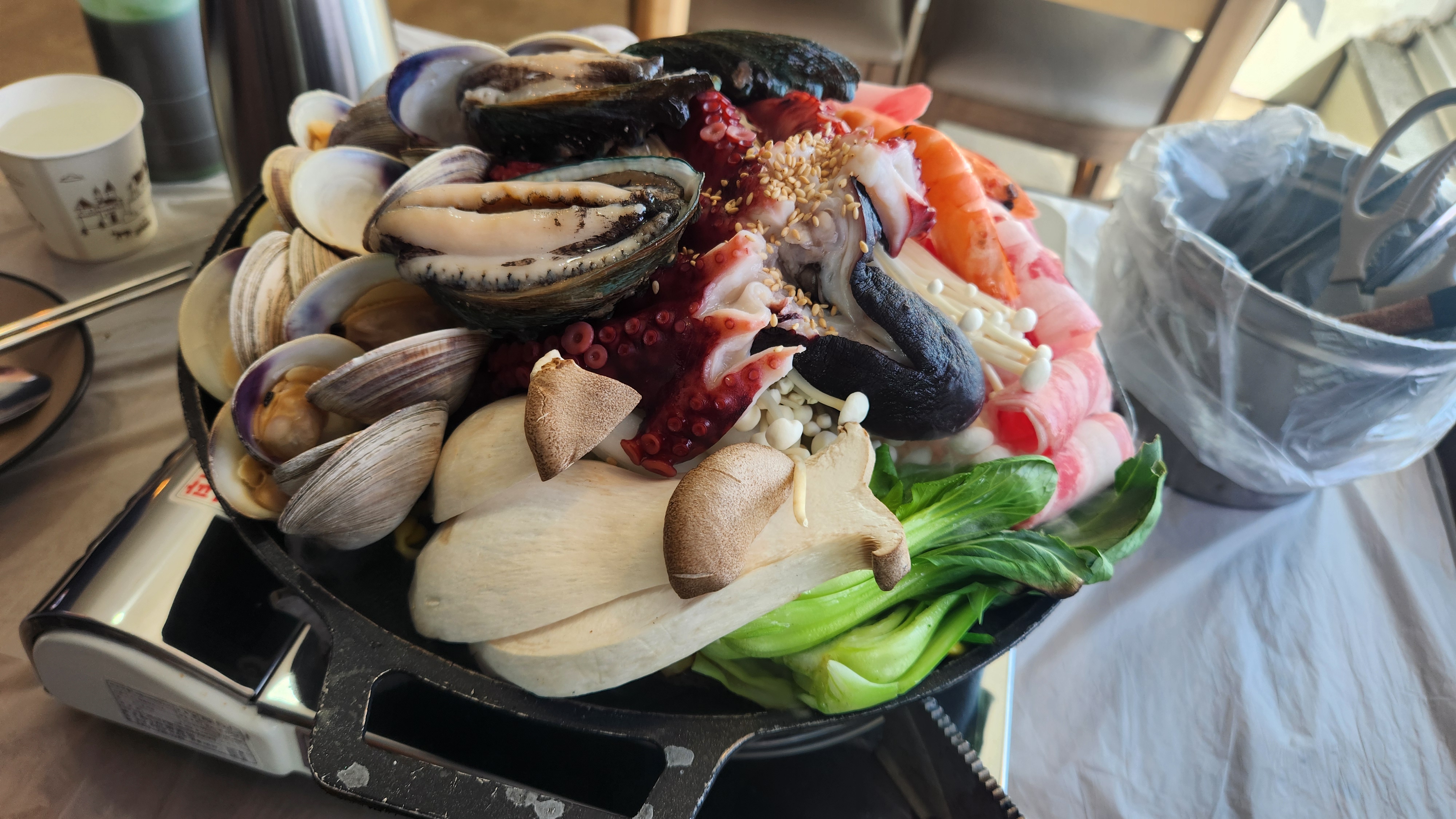 문어해물철판 2인을 주문했는데 문어, 전복, 백합조개,우삼겹,새우,야채가 듬뿍~